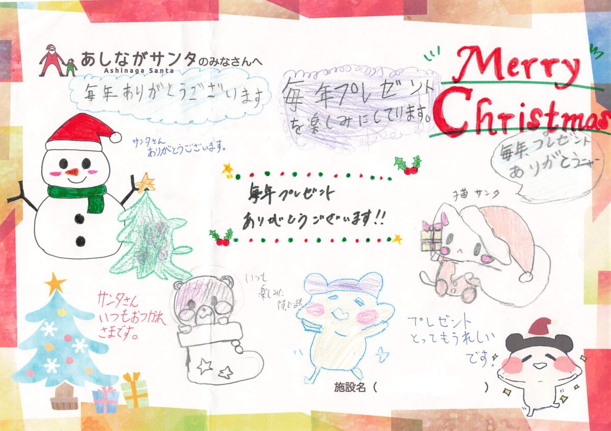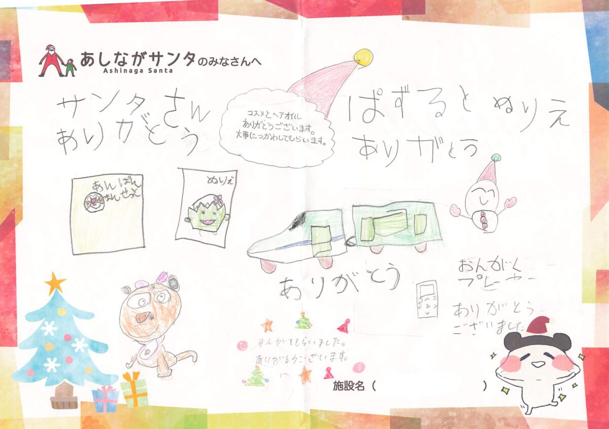 今年もご寄付を届けさせていただいた児童養護施設の子どもたちから、あしながサンタの皆様へお礼のメッセージが財団に届いております。今年もブログ内で、紹介をさせていただいてまいりますので、ぜひ、ご覧くださいませ。