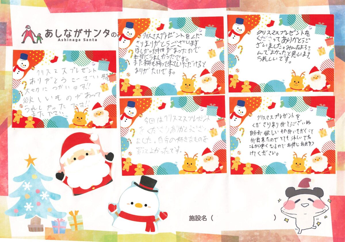 今年もご寄付を届けさせていただいた児童養護施設の子どもたちから、あしながサンタの皆様へお礼のメッセージが財団に届いております。これまでに届いたお礼のメッセージを紹介となります。ぜひ、ご覧くださいませ。
