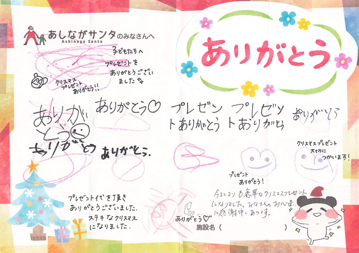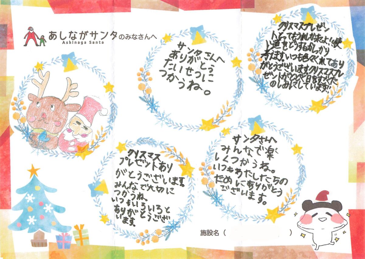 今年もご寄付を届けさせていただいた児童養護施設の子どもたちから、あしながサンタの皆様へお礼のメッセージが財団にたくさん届いております。今年もブログ内で、紹介をさせていただいてまいりますので、ぜひ、ご覧くださいませ。