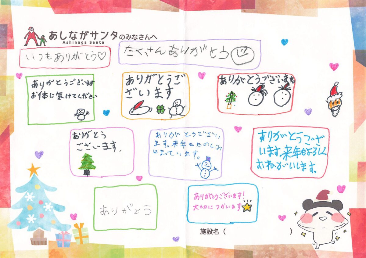 今年もご寄付を届けさせていただいた児童養護施設の子どもたちから、あしながサンタの皆様へお礼のメッセージが財団にたくさん届いております。今年もブログ内で、紹介をさせていただいてまいりますので、ぜひ、ご覧くださいませ。
