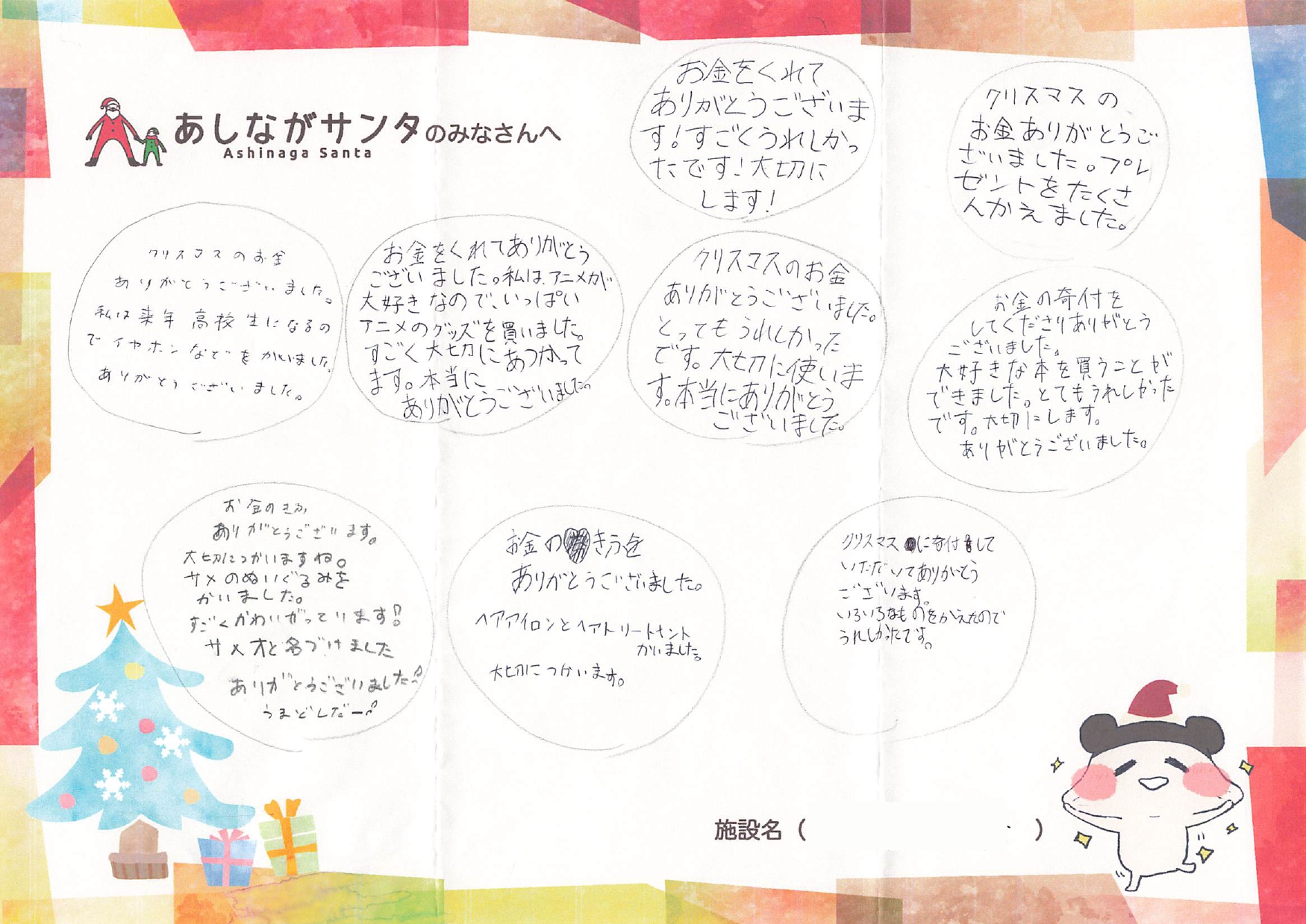 あしながサンタでは、今年もご寄付を届けさせていただいた児童養護施設の子どもたちから、あしながサンタの皆様へお礼のメッセージが財団にたくさん届きました。届いたメッセージ全てを紹介していきたいのですが、一部紹介をさせていただきます。